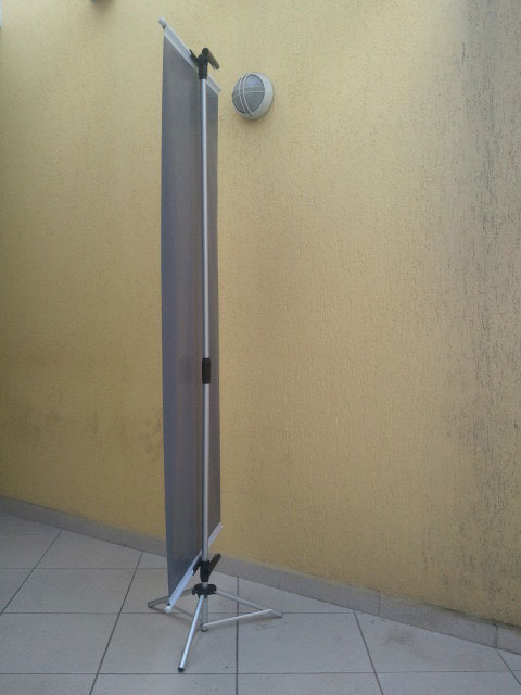 Porta Banner Tripé, estruturas em alumínio fosco, diferentes medida de altura e bases.